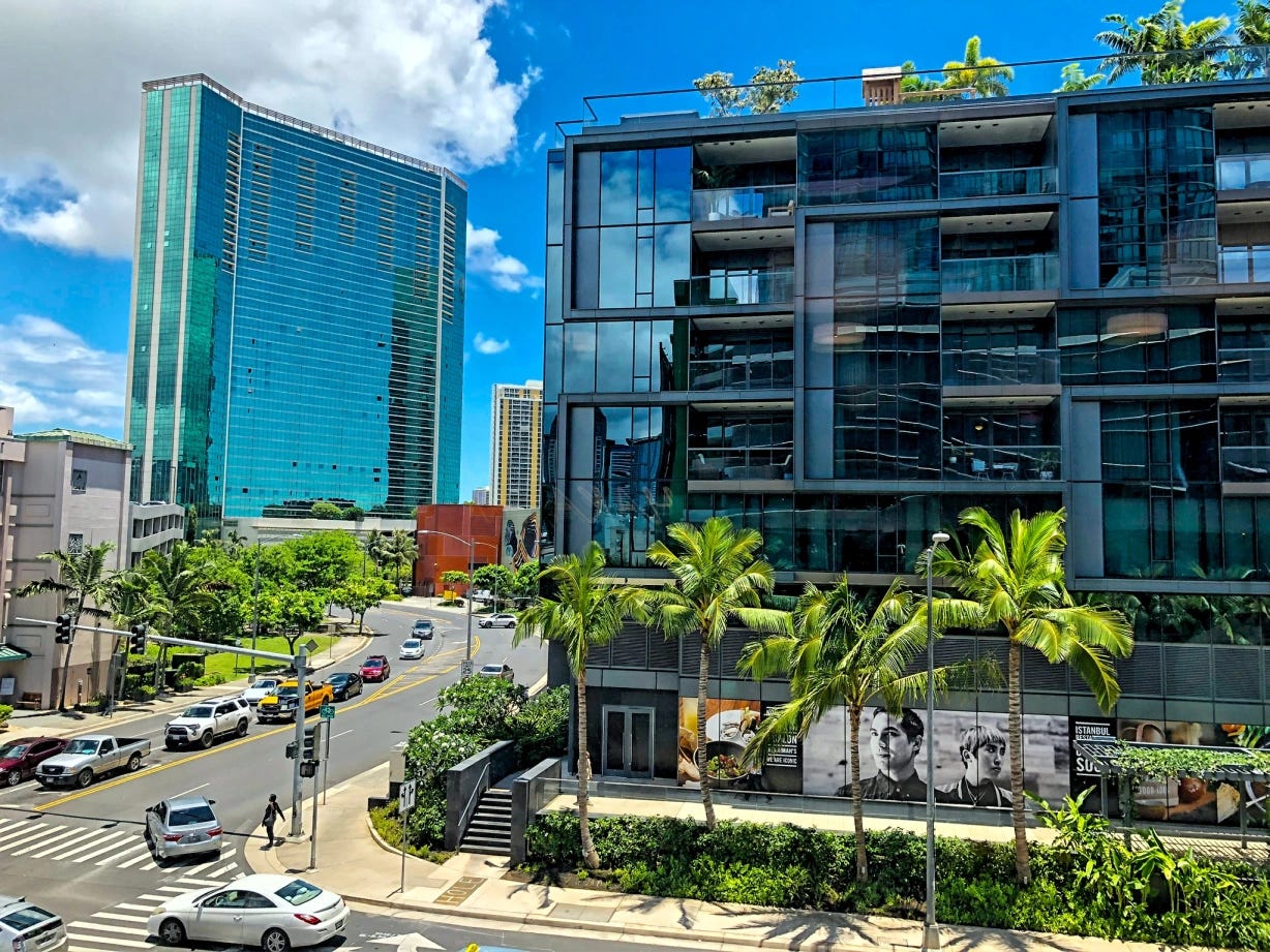 As I was eating lunch at Whole Foods today in downtown Honolulu, Hawaii, I pondered the above scene out my window and realized, except for the palm trees (and even that is common to many U.S. cities), I could be looking at Anywhere, America: similar vehicles, recognizable retail places, large developments wiping out unique stores and hotels, etc. Granted I could have walked three blocks to where I took the beach picture shared yesterday, and clearly that wasn't Anywhere, America. But it does feel like our population centers are rapidly morphing into consistent, rubber-stamped developments of corporate and retail conglomerates.